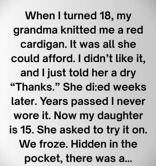 When I turned eighteen, my grandmother gave me a red cardigan—hand-knitted, simple, and not the kind of gift I thought mattered at that age. I