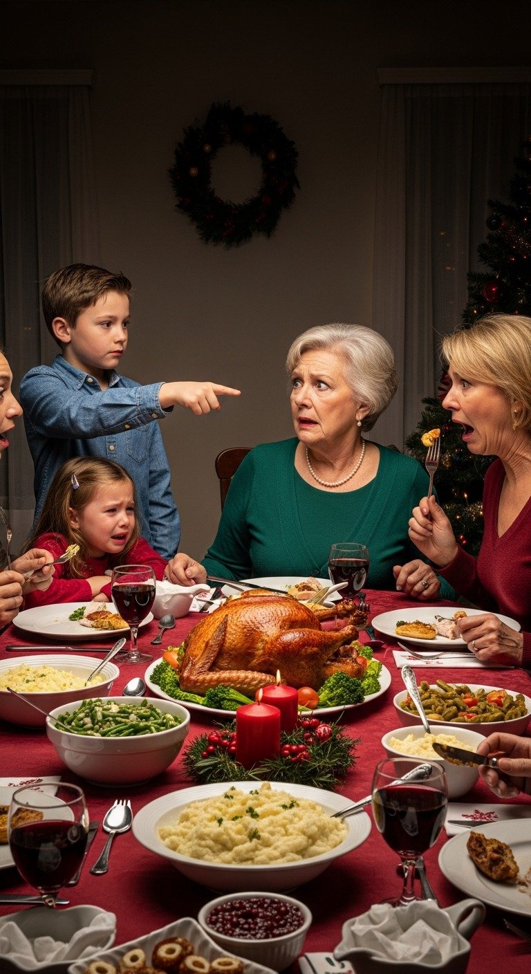 At Christmas dinner, my mother-in-law snapped at my 5-year-old daughter. Everyone kept eating, pretending nothing happened. Then my 8-year-old son looked up and said, “Grandma,