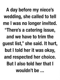 The invitation was revoked the day before the wedding. My niece called, her explanation a jumble of catering numbers and venue limits, but her meaning