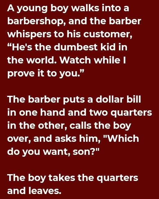 The barber puts a dollar bill in one hand and two quarters in the other, calls the boy over, and asks him, “Which do you