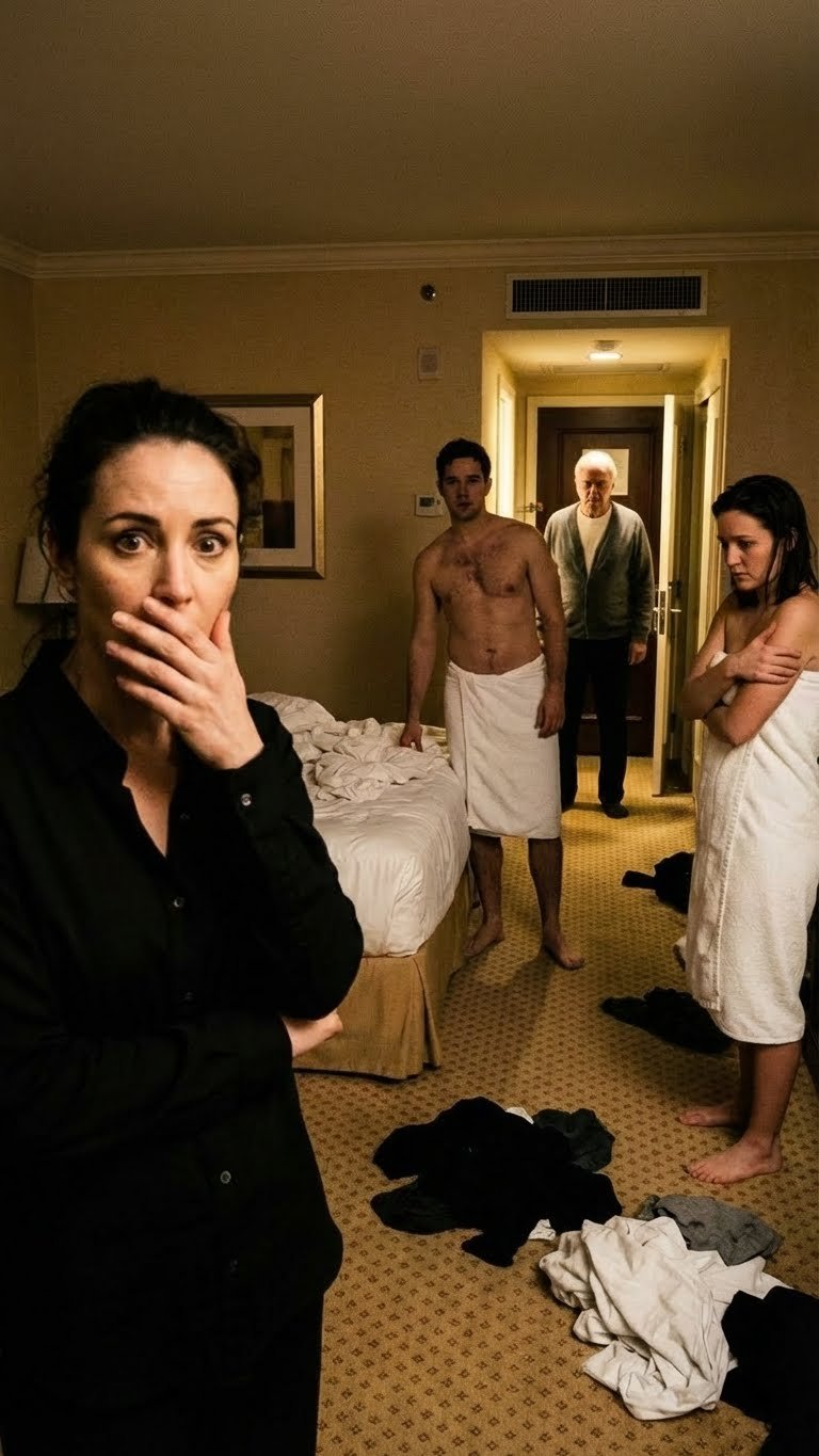 That single word was the catalyst. Rafael pushed past his frozen son, shoving the door wide open and striding into the room without a word. The scene inside was one of sordid cliché: a rumpled bed, discarded clothes, two glasses of champagne on the nightstand. Marina scrambled backward, clutching a silk jacket to her chest, her face a mixture of fear and confusion. She looked from the stern, imposing figure of Javier’s father to the weeping woman at the door, her confidence evaporating in an instant. I remained in the doorway, a silent sentinel, breathing slowly and deliberately, focusing on keeping my own body from trembling. I was the architect of this moment, and I would see it through.