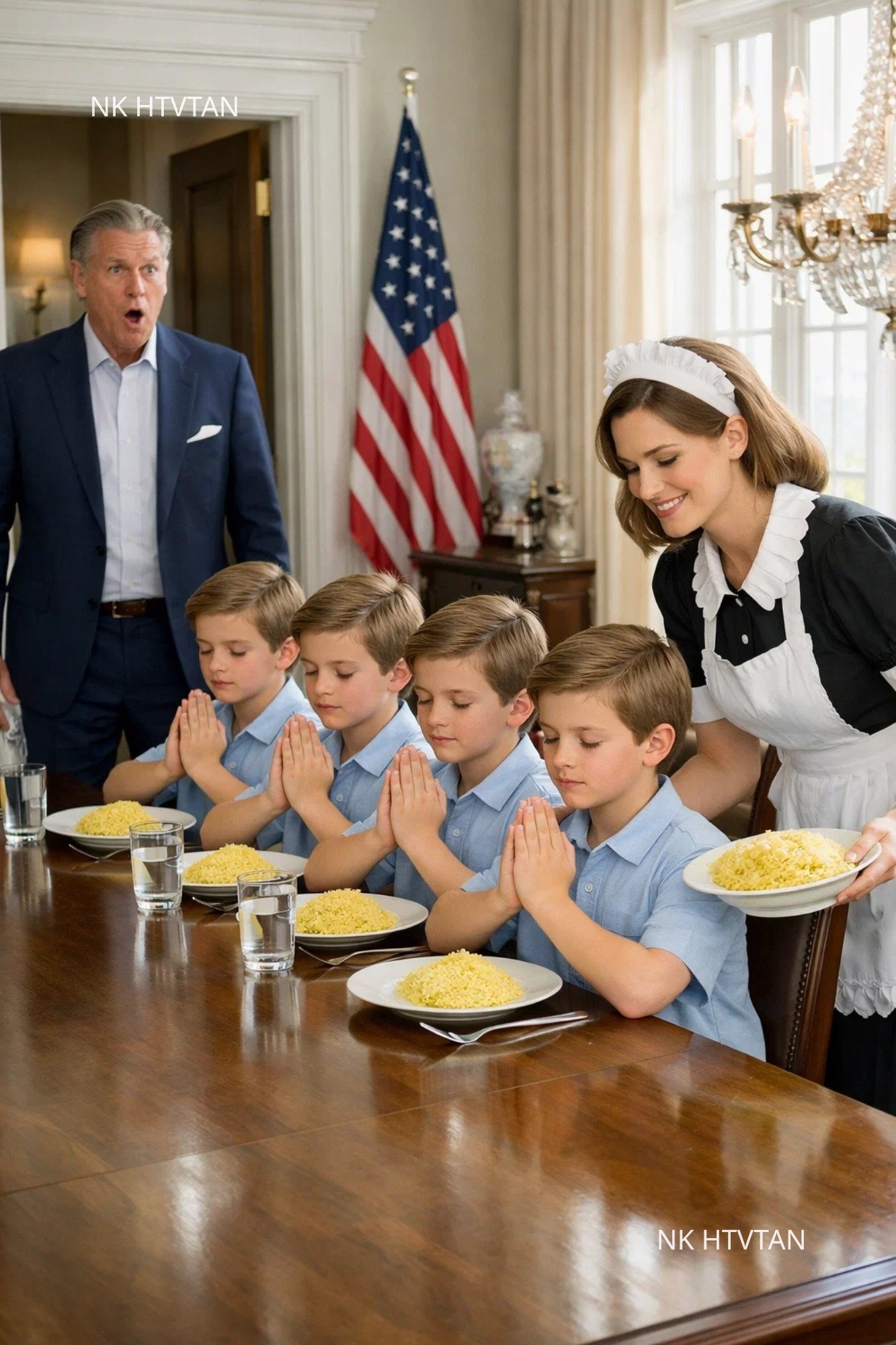 They wore blue shirts that struck Alejandro’s memory like a distant bell, a design he had once ordered in bulk from a tailor in Milan decades earlier, shirts he had donated or discarded, now crudely resized with uneven seams. Over those shirts, improvised light aprons protected their chests as if they were guarding something precious. Elena leaned forward with a large spoon filled with bright yellow rice that steamed modestly in the chandelier light, humble grains stained gold with turmeric or cheap coloring. It was not the cuisine of wealth but the food of survival, and yet the boys watched it like treasure.